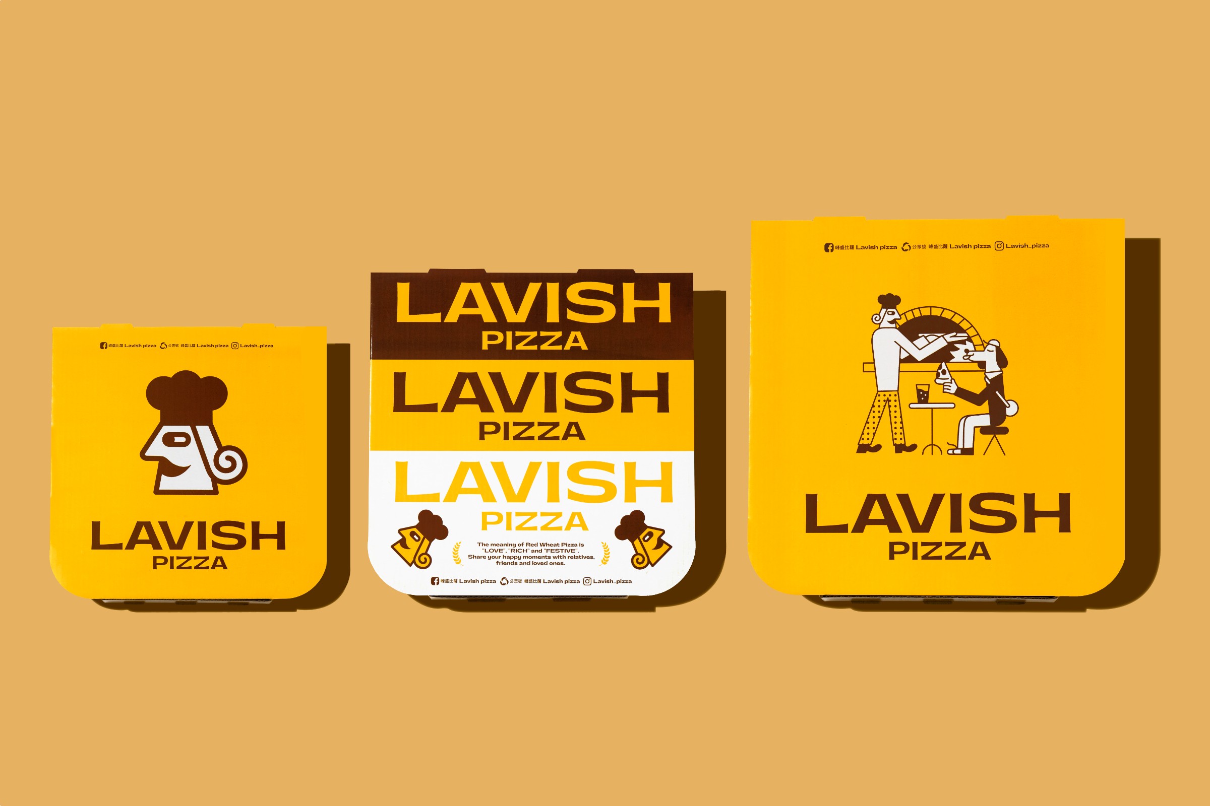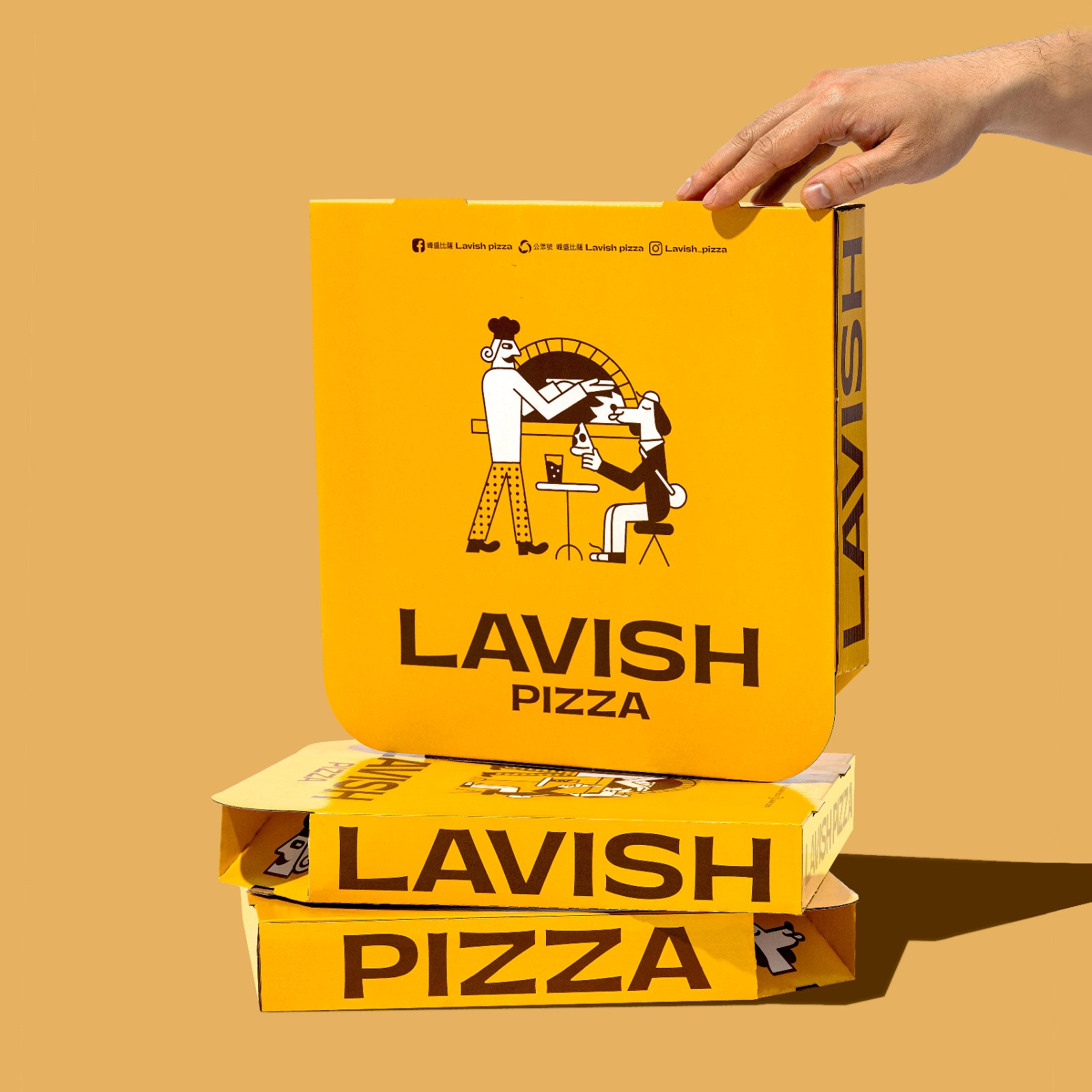 When doing the rebranding for Lavish Pizza, we use characters as the core visual of the brand. With the chef of Lavish Pizza as the main character Lavish, who is a chef who is obsessed with developing new pizzas. There is also a group of Lavish pizza lovers: a gluttonous dog that follows Lavish all the time, an office lady who loves discounts, and an alien KOL who always shares delicious food with his fans. The story of the brand occurs around these four main characters. In addition to upgrading the overall image, it also allows customers to have a stronger connection with the brand. The new visual image includes logos, fonts, colours and characters, etc., inheriting the innovative spirit of Lavish's continuous research and development, and bringing vitality into the design. This not only makes the visual refreshing but also makes the brand more contagious.