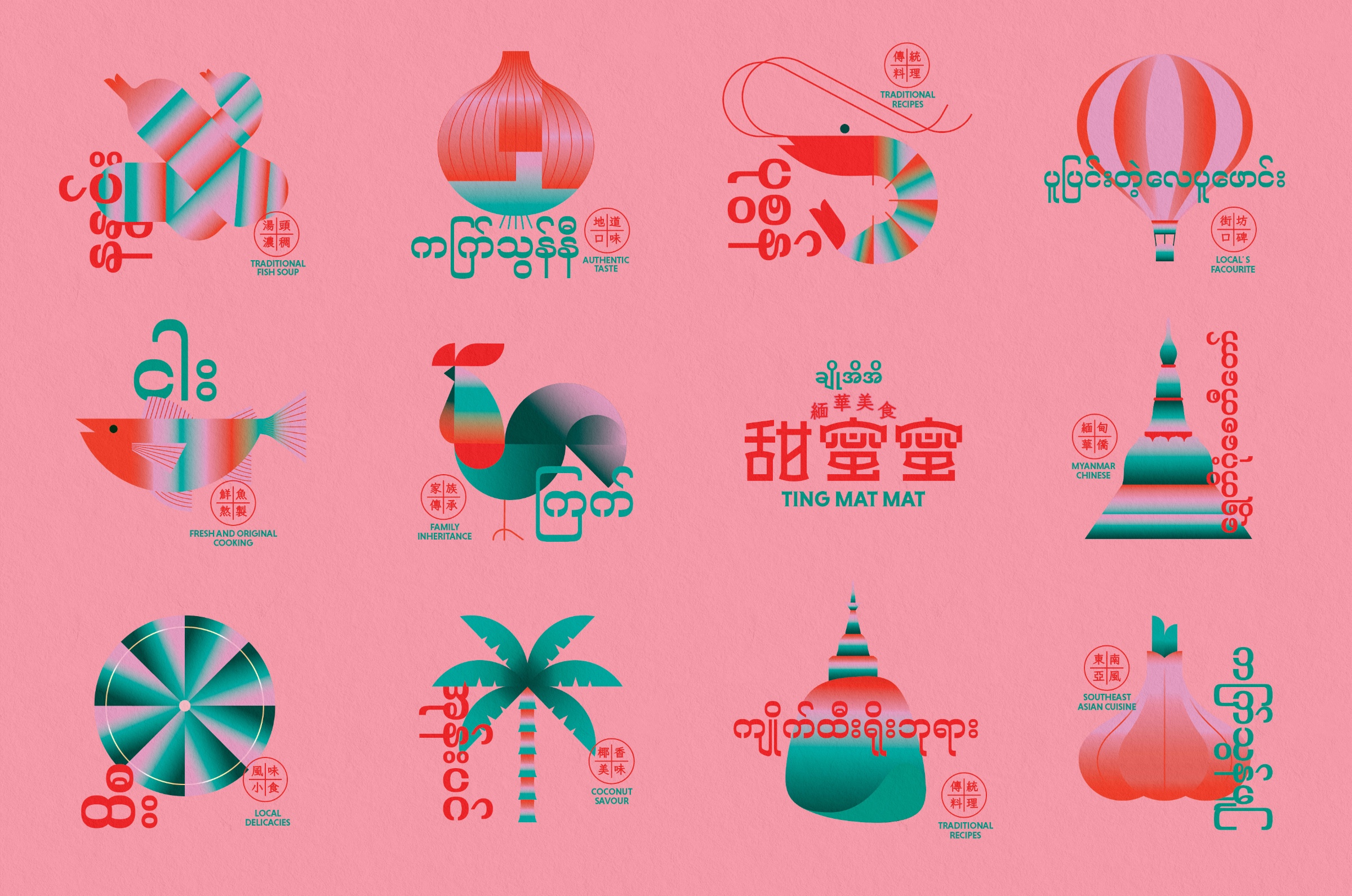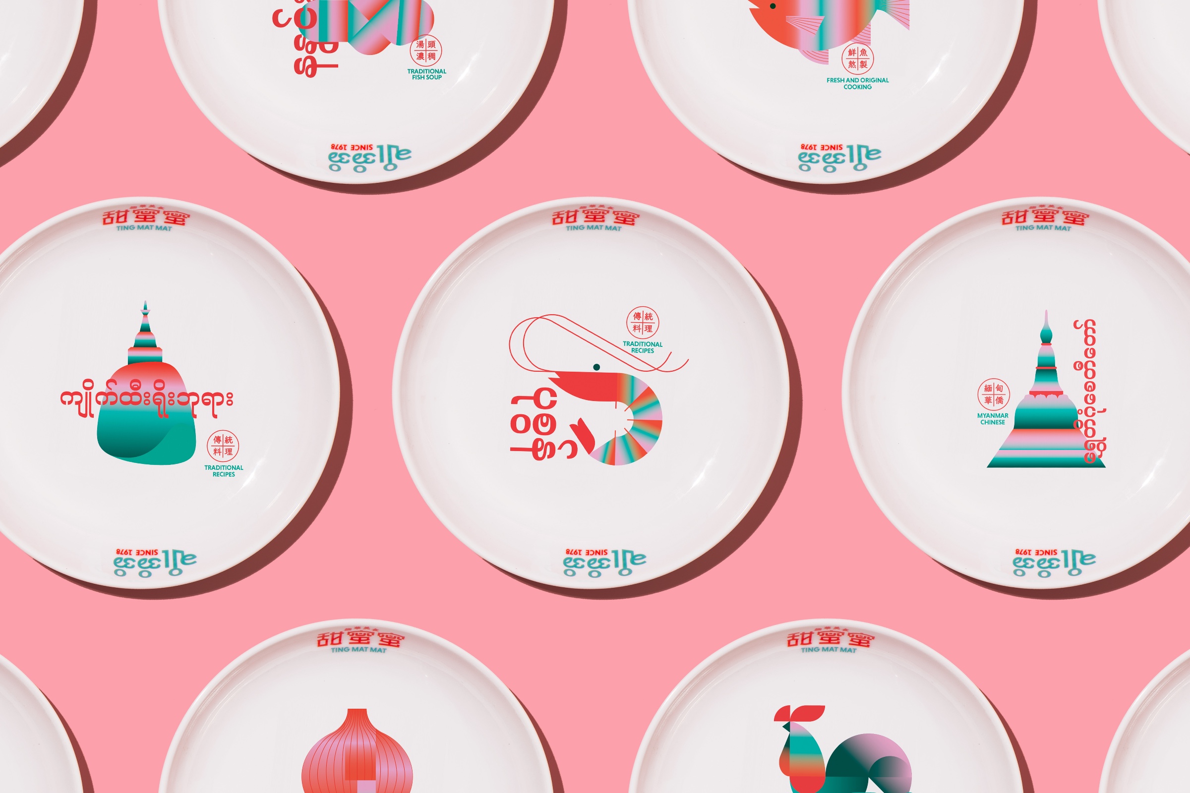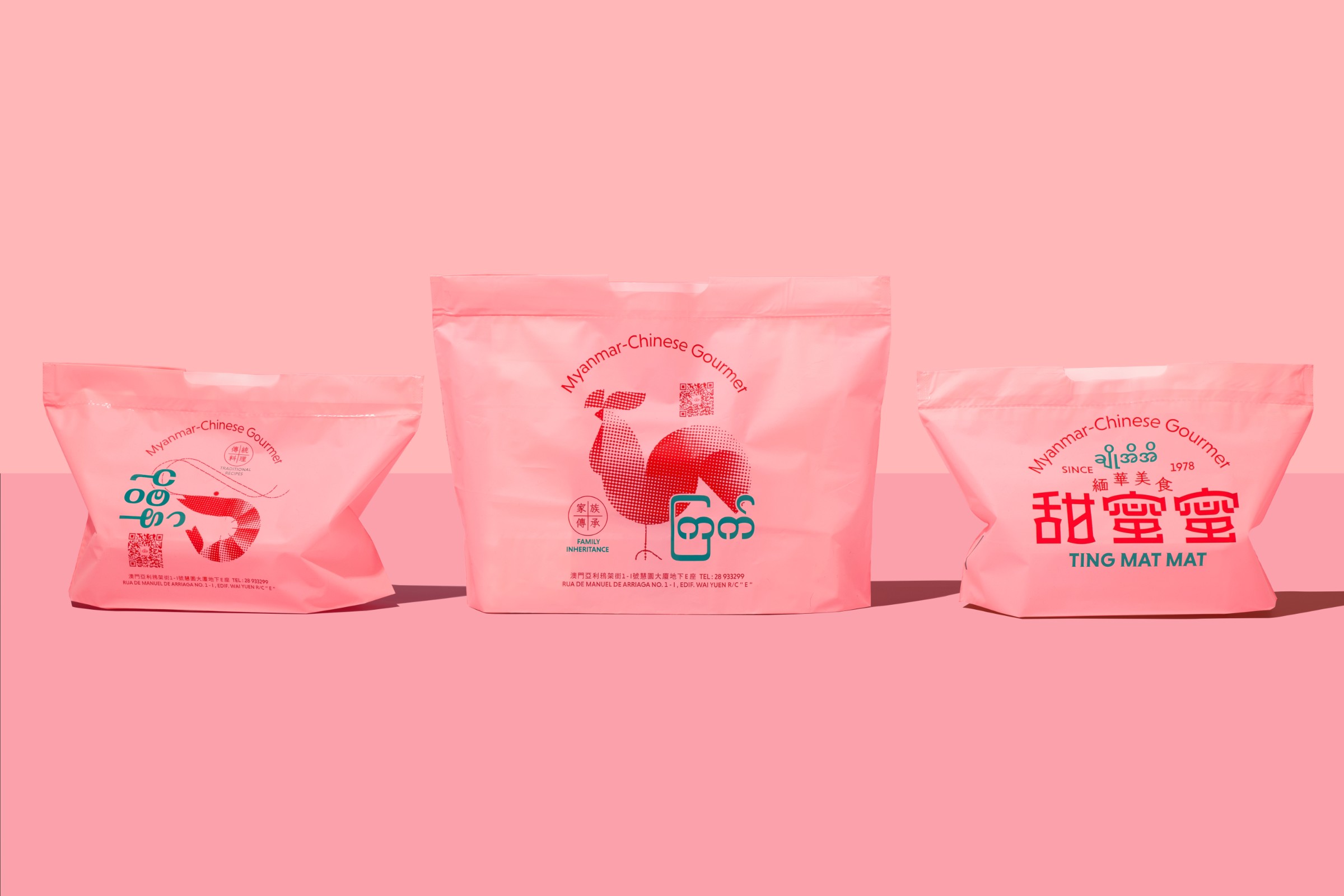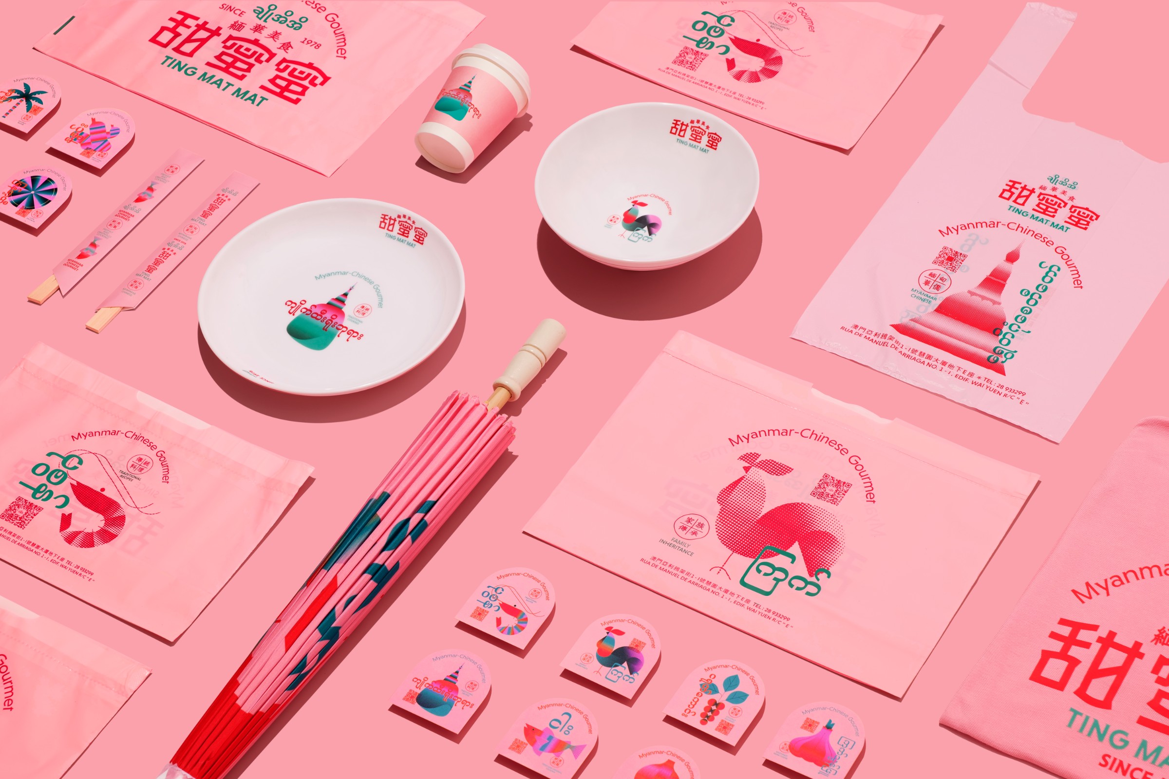 During this period, the design team conducted in-depth research on Myanmar and Chinese characters, and explored the similarities and differences between the two cultures. Finally, the design team designed a brand visual design with Chinese and Myanmar as the main language, supplemented by English, rich in the cultural connotations of the two places. The visual system adopts the color matching full of Myanmar Chinese cultural characteristics, and the representative elements representing Myanmar are translated into fashionable illustrations. Through Macao as a catalyst for the inheritance and development of Myanmar's Chinese culture, TING MAT MAT continues its history, culture and heritage to the world through brand design.