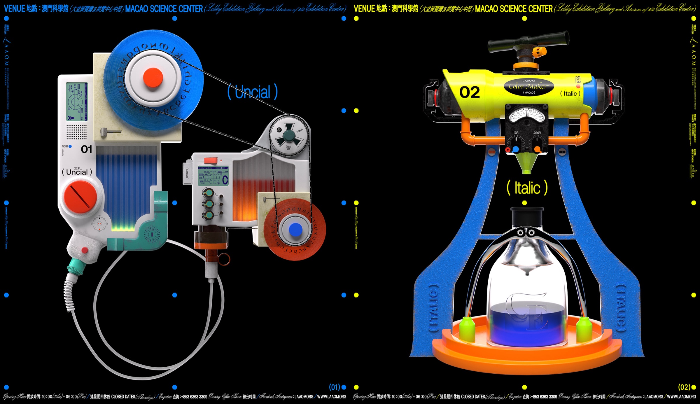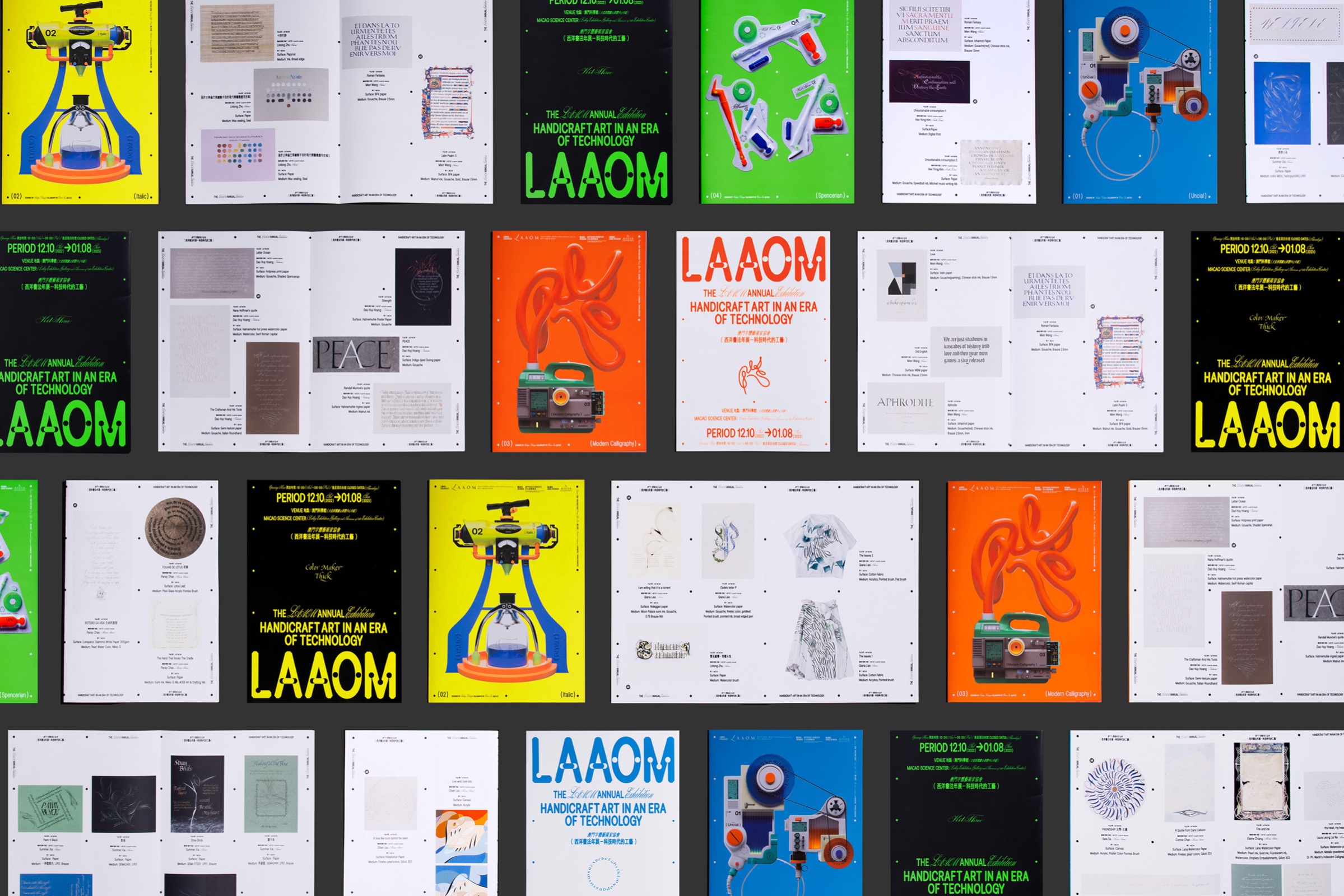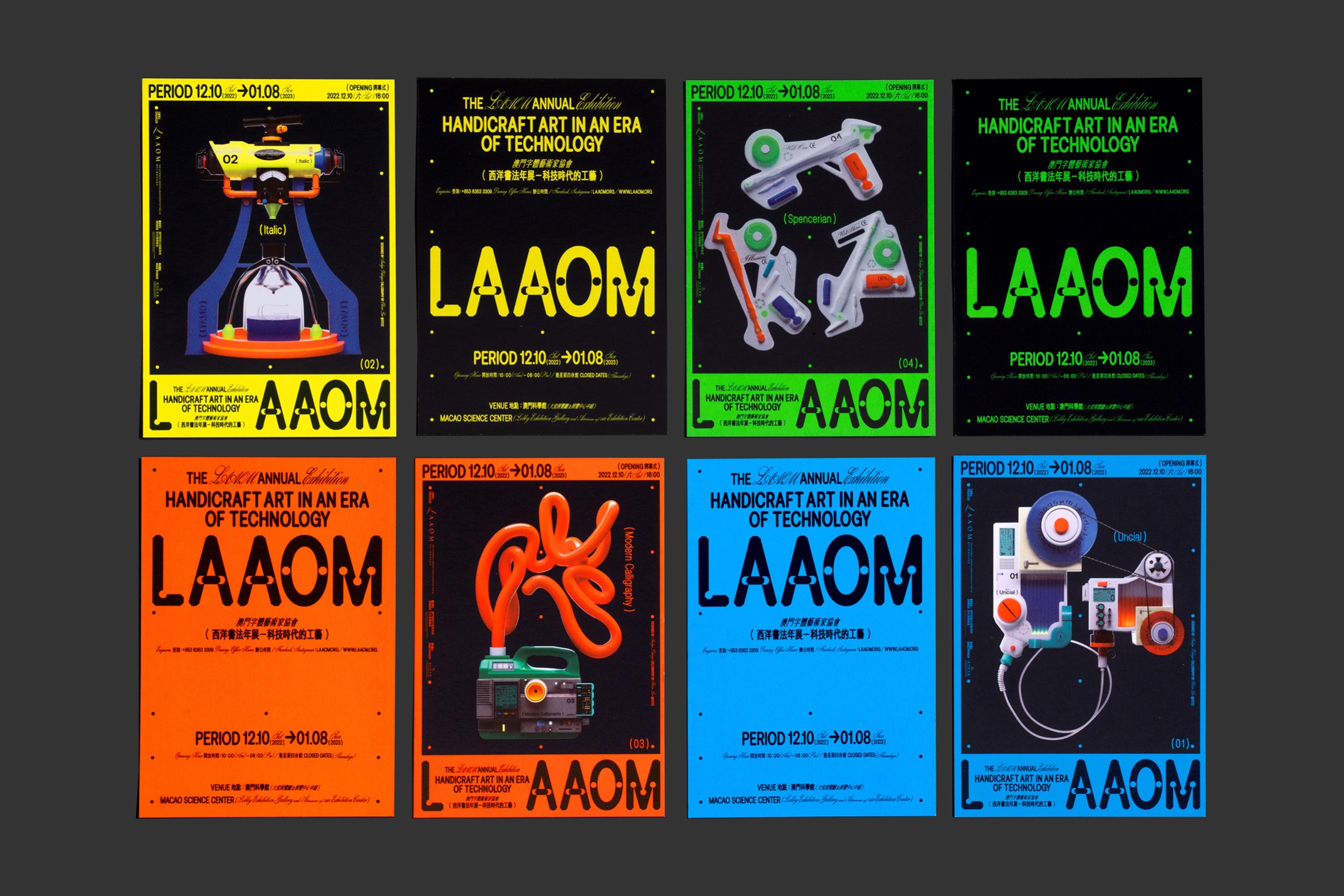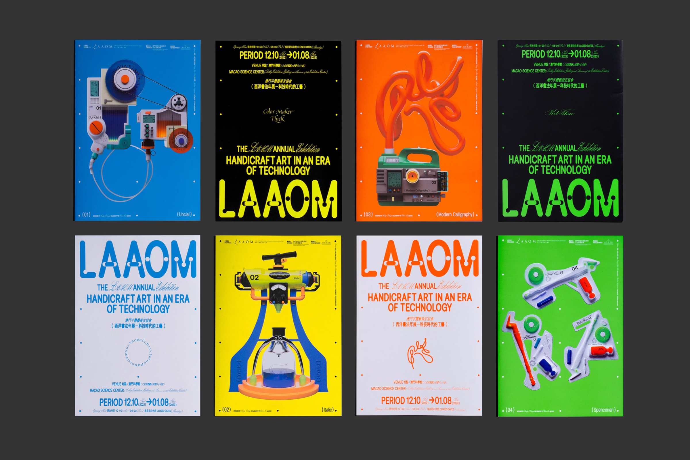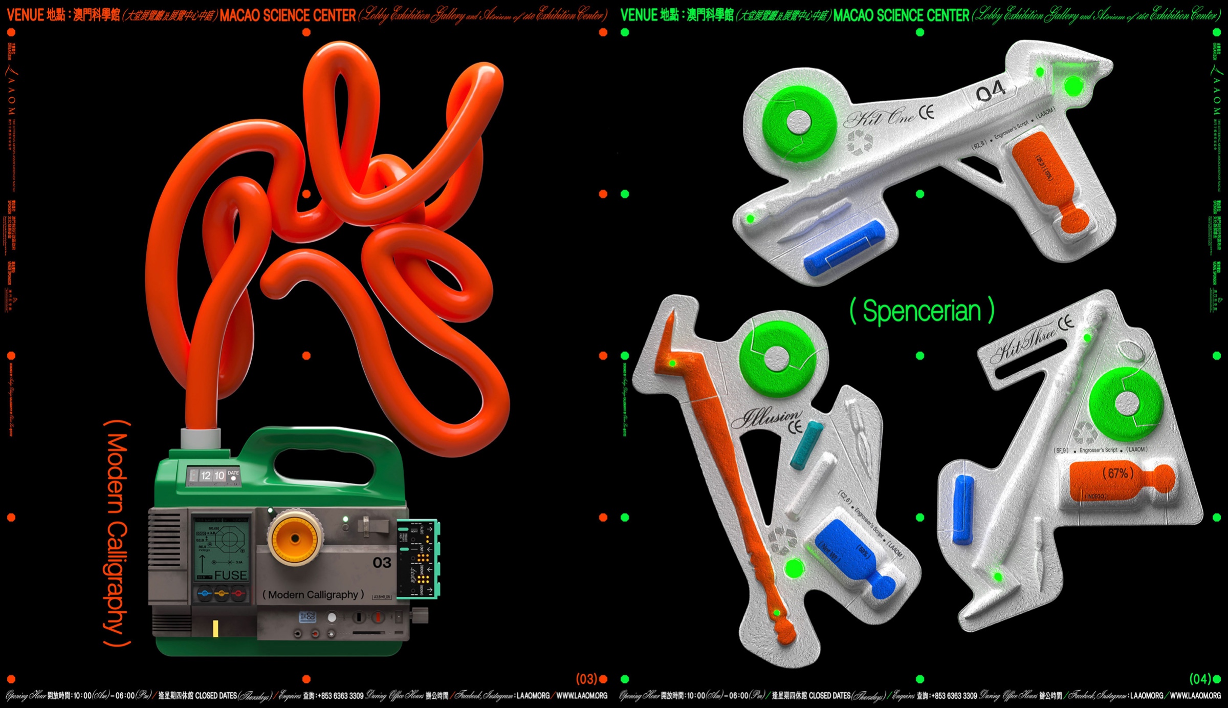 The exhibition invited 18 western calligraphers from various countries, and exhibited more than 60 western calligraphic works and works of art created around the theme of "Technology in the Age of Science and Technology". In response to the theme of the exhibition, the design team boldly imagined and simulated a avantgarde "Western Calligraphy Tool Set of the Future" as part of the main vision of the exhibition, so as to echo the theme of the exhibition. In the main vision, the four future Western calligraphy tools are inextricably related to the future technology and digital development, which breaks the traditional concept inherent in Western calligraphy; At the same time, the design team brings out strong visual tension in the main vision by combining western calligraphy fonts and futuristic fonts. This means that under the influence of the rapid development of modern science and technology, the classical and elegant western calligraphy is also constantly transforming and revolutionizing its endless potential, to express that the development of western calligraphy and even font design is keeping pace with the times, and the future is still full of endless possibilities.
